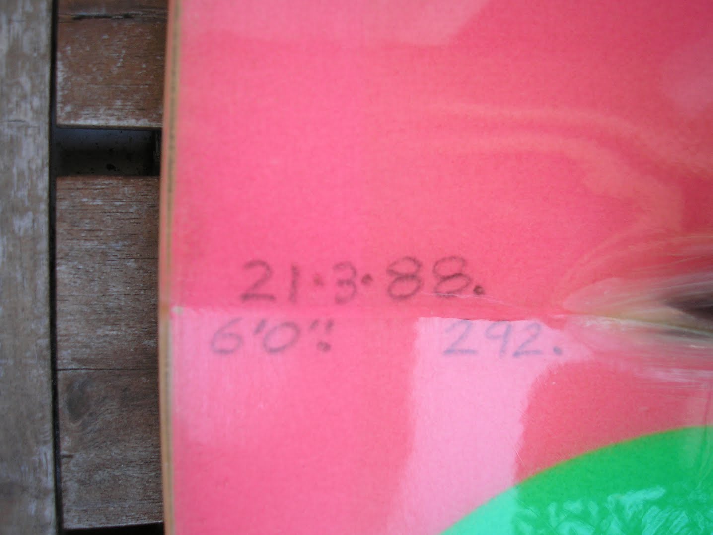 Here's another couple of Freedom thrusters from Stephane made in 1988. Amazingly enough after all these years they were made less than a day apart ! Both shaped by Gordon Jackson in Jersey and obviously part of the same shipment to a surf shop in France, probably the Freedom shop in Biarritz . They are both in great condition with their original quality gloss coats, loud graphics and sprays. The pink one has never been surfed, Stephane found it on a surf shop ceiling in Saint-Jean de Luz. Its 6 ft and dated 21/3/88 and is perfect. The green one ain't bad either, 6'7 and dated 22/3/88.