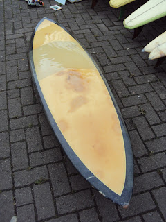 This one ,seen at the surf meet in Braunton, is an earlier board and a 'Graham Nile model'. St Austell power surfer Graham was H&H's team rider, and took one of their boards to the World championships in 1970. Whether this was actually shaped by Graham , or his personal board, we don't know yet. I'll have to ask Rob Hendy who is now a busy man in the world of magic !